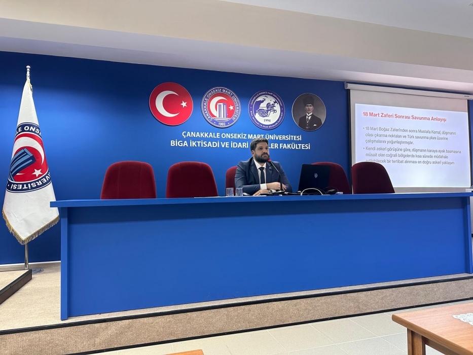 “Atatürk ve Cumhuriyet” başlıklı sunumunda Osmanlı İmparatorluğunun yönetim şekli monarşiden Türkiye Cumhuriyeti’ne giden süreci 1915 yılından başlayarak anlatan Dr. Öğr. Üyesi Hafize Seçtim, Türk Kurtuluş Savaşı’nın, Atatürk gibi eşsiz bir liderin önderliğinde, Türk ulusunun eseri olarak kazanıldığını kaydetti.